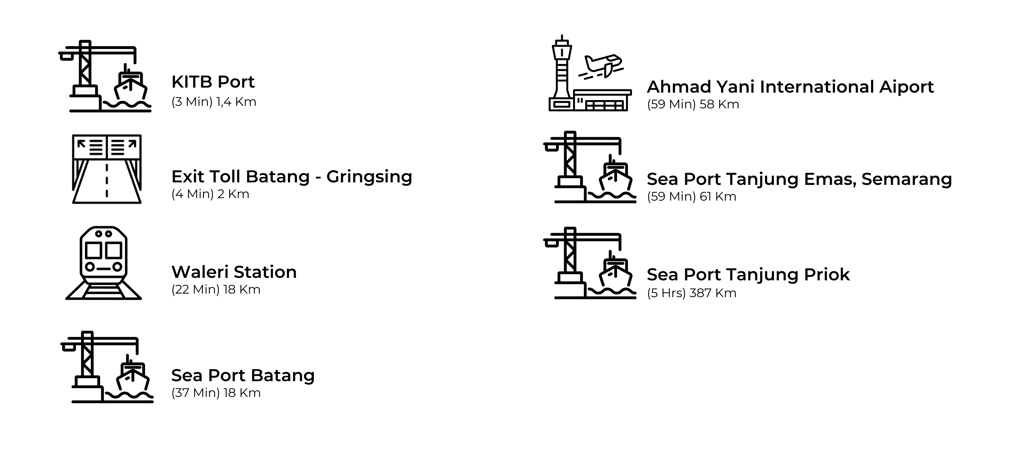 Grand Batang City dilengkapi dengan infrastruktur kelas dunia, mewakili kawasan yang mendukung keberlangsungan operasional dan pertumbuhan industri. Fasilitas unggulan yang ada di kawasan ini antara lain :